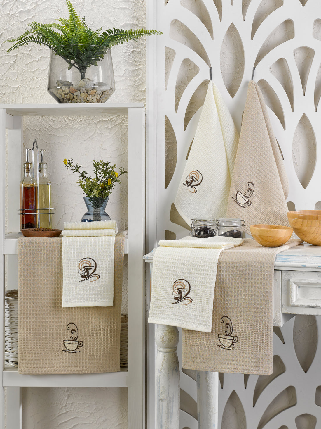 Bej - Sophia 6'lı 30x50 Cm El Ve Yüz Havlu Seti Mutfak Havlusu