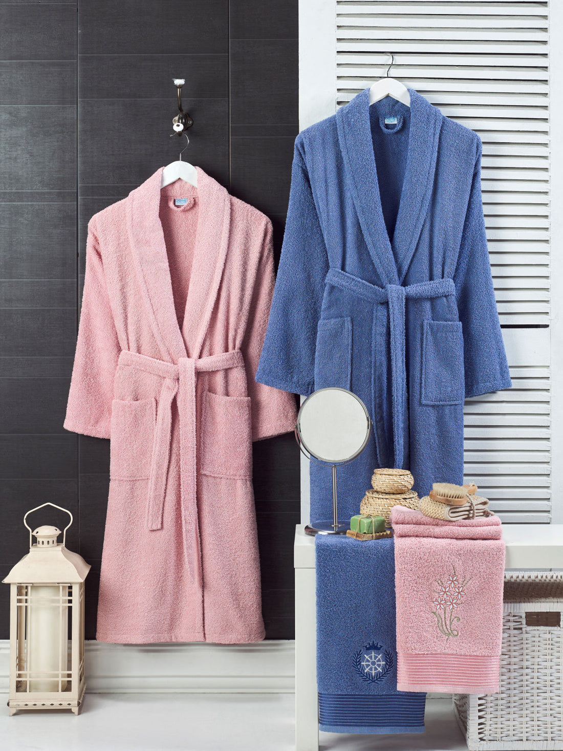 Pudra-Lacivert - 4'lü Baş Havlulu Bornoz Aile Seti